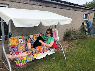 Since we have been enjoying great weather it was decided that we would move the old garden yurt to a new spot. Genghis Khan may have had the resources to move the whole thing on a specially adapted horse-drawn chariot but we had to take ours apart. It had been in a rather damp dip in the main garden, under trees for 11 years and was looking very much worse for wear. We have moved it into a sunnier spot behind my workshop which used to be a chicken run. We decided that since we won’t be going to any festivals this year it could be the site of our own mini version. The old chicken shed looks like a ticket office but it will eventually get shifted. Because it is a smaller area and has walls all around, this garden is much more sheltered. It is a scruffy area, rather overgrown so we are tarting it up by planting wild flowers, hanging dangly things from a chain strung from the building to a sturdy fence post. I had to climb over barbed wire to tie off some rope as quickly as I could without the cows in the neighbouring field spotting what I was up to. I bought a cheapo swing-seat online that made me resort to “Man-Help” as the crappy screw holes did not line up properly.
