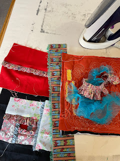 I have loaded an experimental project onto my quilt frame. I am hoping to make non-slip sofa covers to replace the hideous stretchy nylon ones. I have 2 lovely red leather vintage sofas but keep them covered up so pets can sit on them too;) The “quilt” is red fluffy fabric and rubbery stuff to stop rugs from slipping (no wadding) so it will be interesting to see if that works.